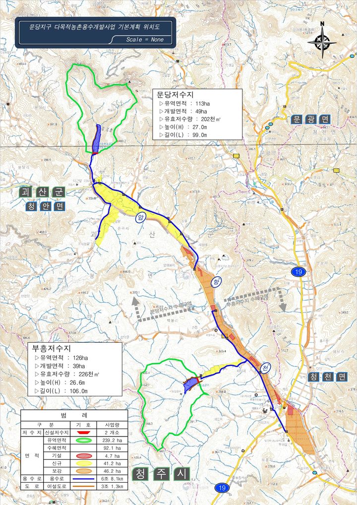 이번 다목적 농촌용수 개발사업을 통해 농업용수 공급이 어려운 괴산군 청천면 문당리와 청안면 부흥리에 각각 유역면적 113㏊·126㏊, 저수량 20만2000㎥·22만6000㎥의 저수지를 신규 축조한다. 인근에 용수로 8.1㎞, 이설도로 1.3㎞도 들어선다.